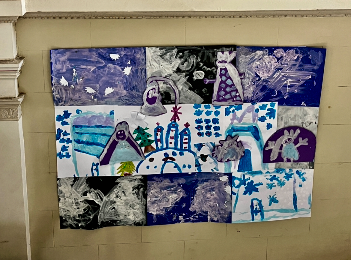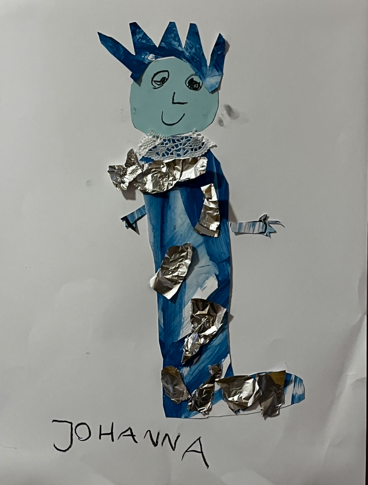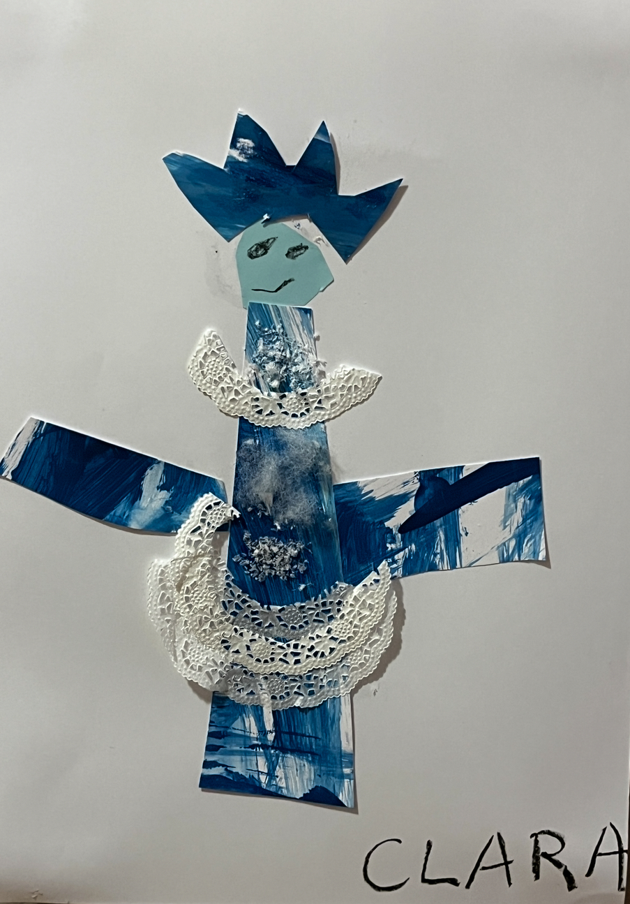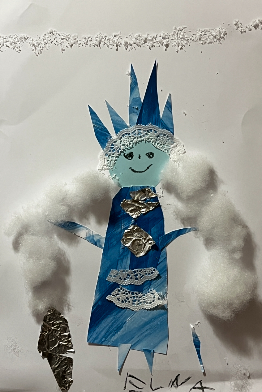 In unserem Atelier haben wir uns intensiv mit dem Märchen „Die Schneekönigin“ von Hans Christian Andersen beschäftigt. Nachdem unsere kunstliebende Erzieherin die Geschichte vorgelesen und gemeinsam mit den Kindern thematisiert hat, entstand die Frage: Wie sieht eine Schneekönigin eigentlich aus? Schnell war klar – sie ist groooß und füllt das ganze Blatt aus! Inspiriert von dieser Vorstellung gestalteten die Kinder einzelne, ganz individuelle Schneeköniginnen. Ein metergroßes Gemeinschaftsbild schmückt nun unseren Marmortreppenaufgang und lädt zum Staunen ein.