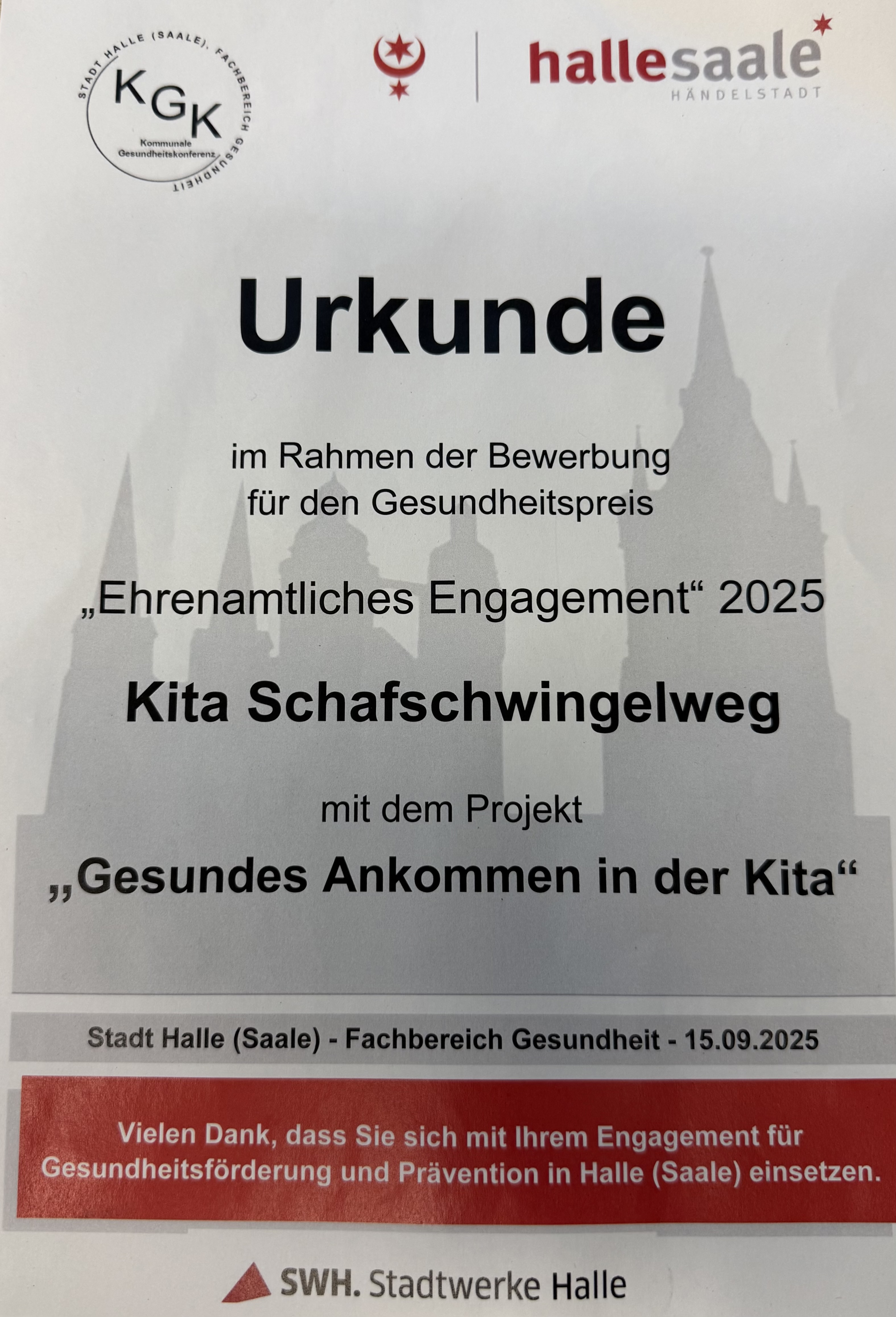 Wir freuen uns sehr, dass unser Engagement gewürdigt wurde: Obwohl wir nicht unter den ersten drei Plätzen gelandet sind, wurden wir von der Stadt Halle mit einem Gesundheitspreis für ehrenamtliches Engagement ausgezeichnet. Diese Anerkennung bestärkt uns darin, unseren Weg einer gesundheitsbewussten und wertschätzenden Kita-Gemeinschaft weiter fortzusetzen.