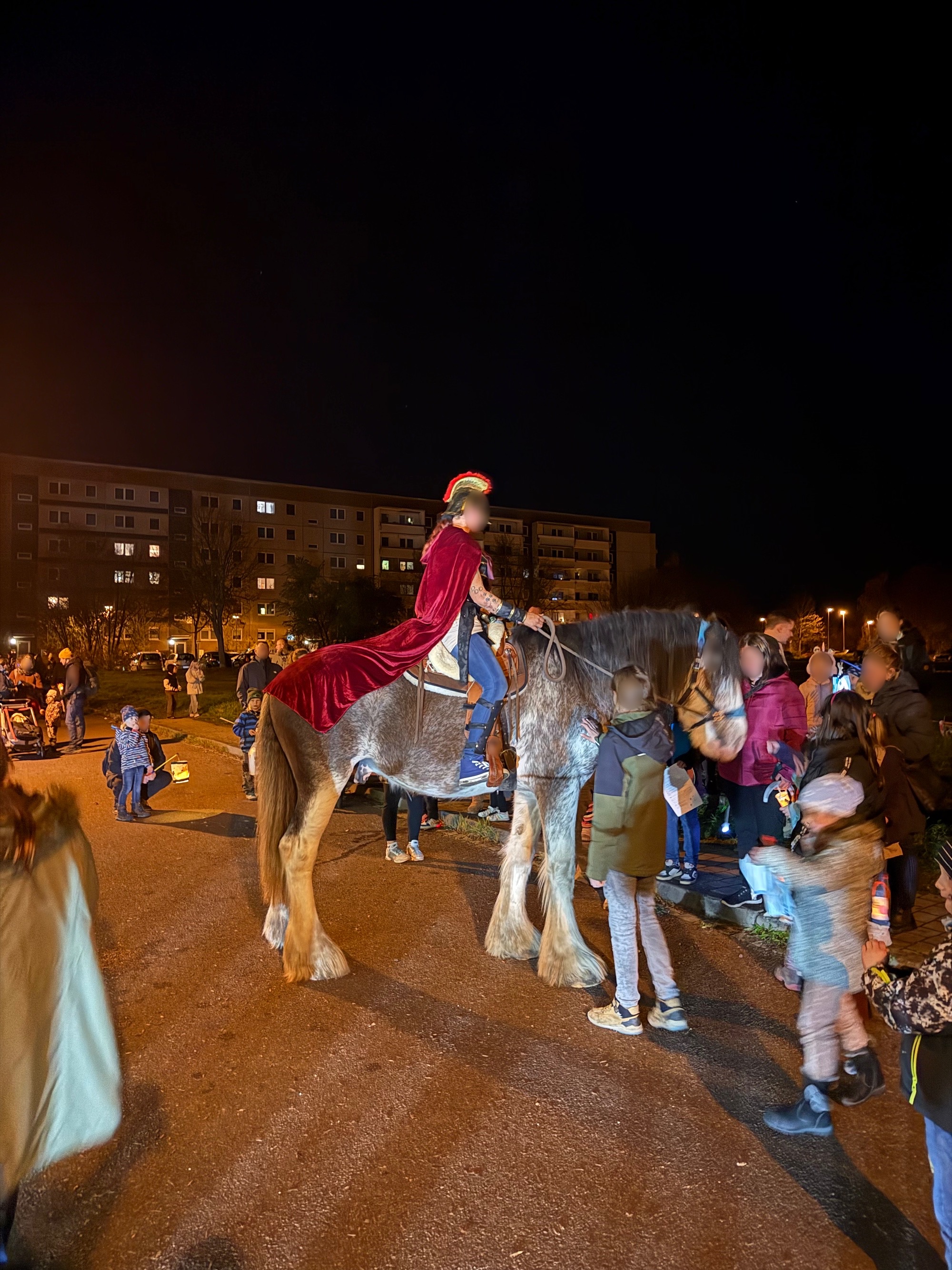 Ein besonderes Highlight war wie jedes Jahr der traditionelle Laternenumzug. Ein großes Pferd mit Reiter führte den Zug an, begleitet von stimmungsvoller Musik und den selbstgebastelten Laternen der Kinder.